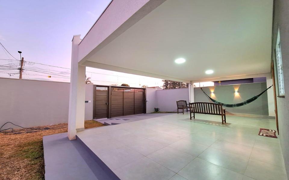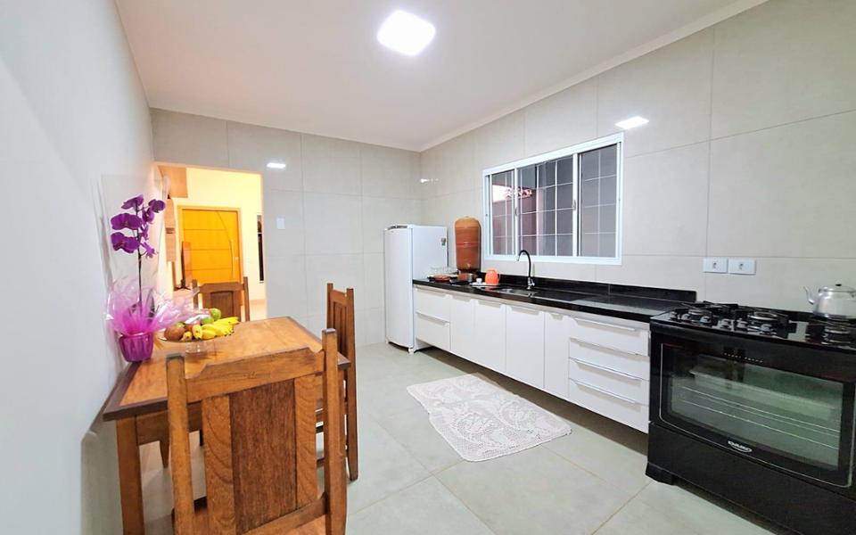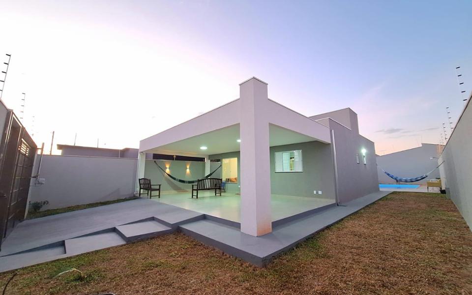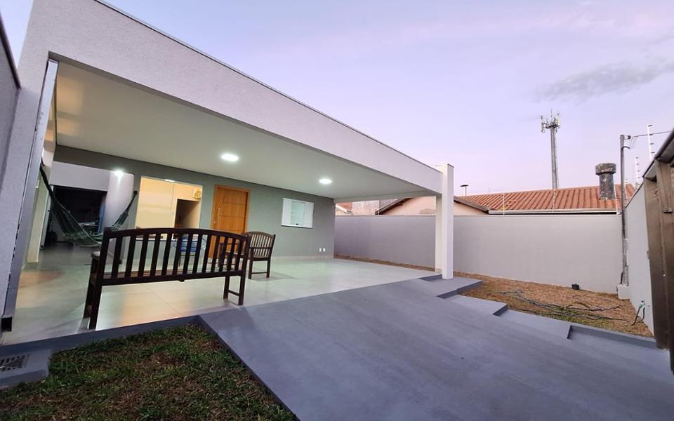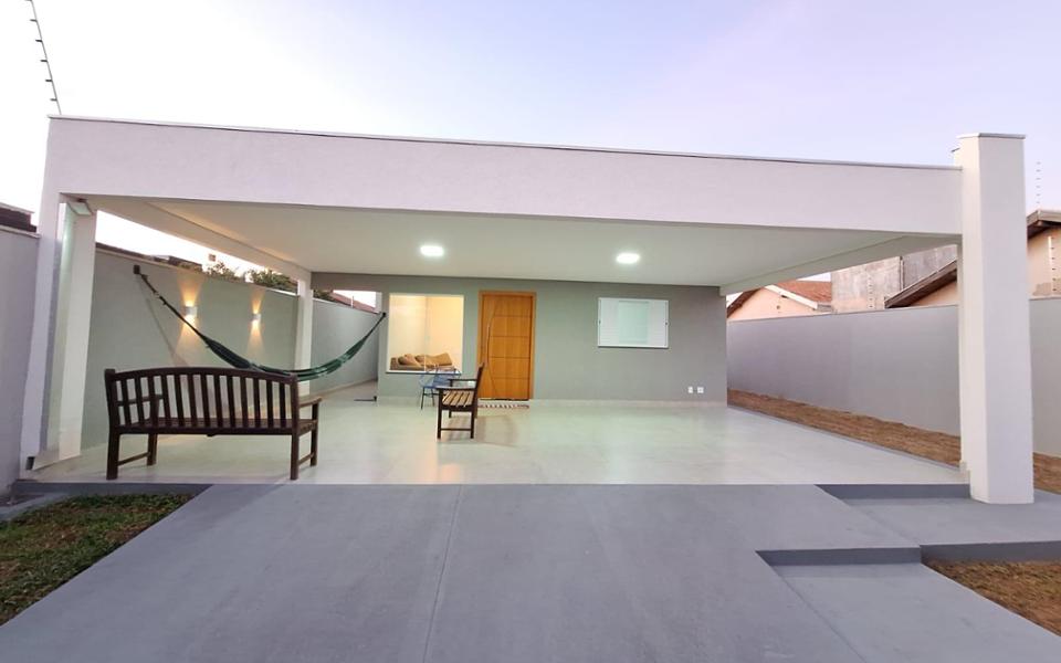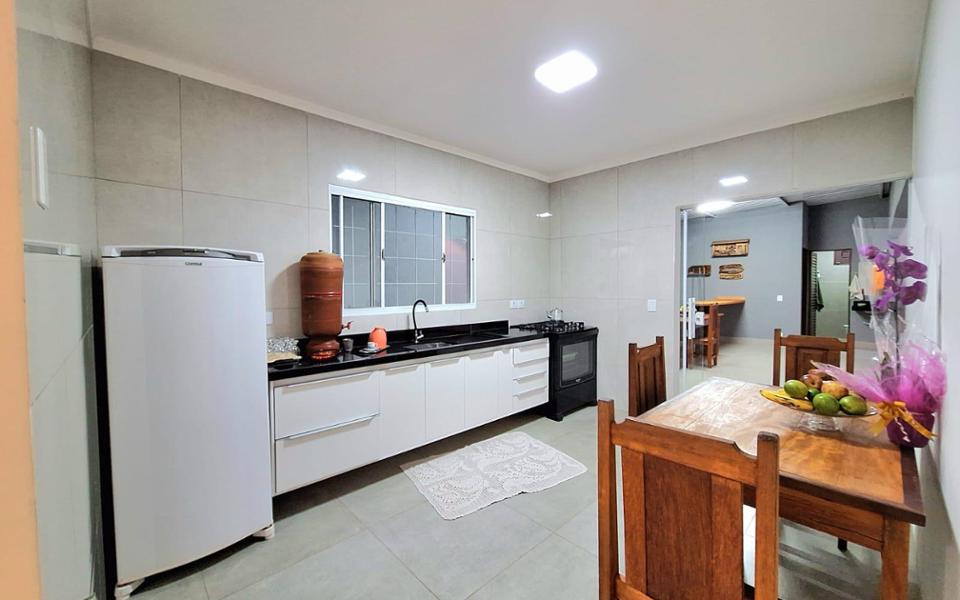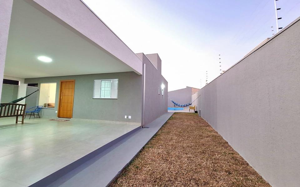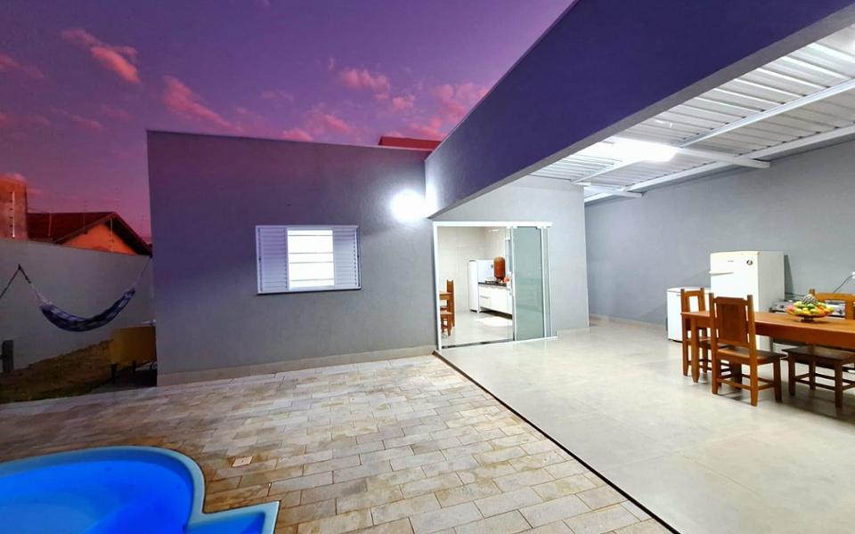 Excelente casa contendo sala de estar, 1 suíte, 1 quarto, banheiro social e cozinha. Planejados na cozinha, na suíte e nos banheiros. Na área externa, possui uma varanda lateral, mais 1 quarto, 1 banheiro completo, área de lazer com piscina, área gourmet com planejados, churrasqueira, balcão e pia. Garagem coberta para dois carros e abrigo para mais um carro.