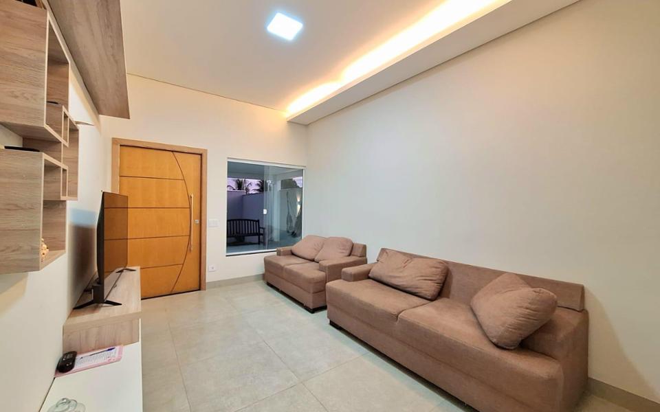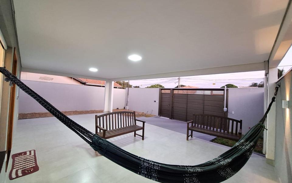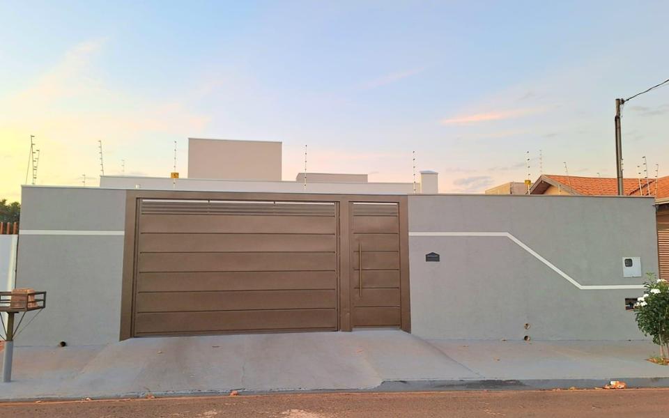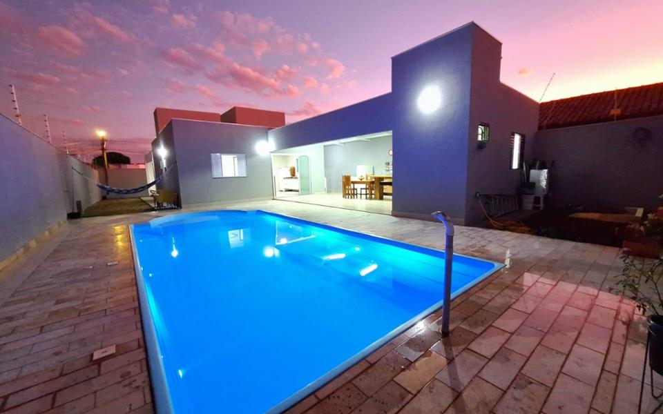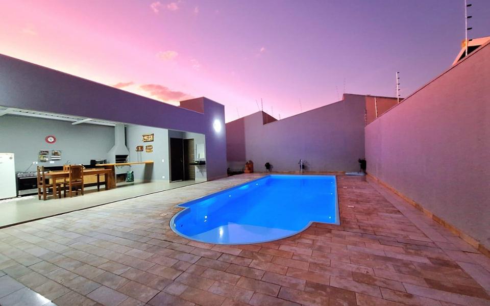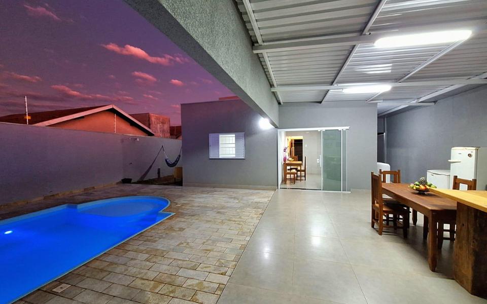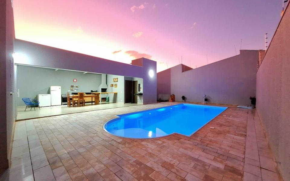 Excelente casa contendo sala de estar, 1 suíte, 1 quarto, banheiro social e cozinha. Planejados na cozinha, na suíte e nos banheiros. Na área externa, possui uma varanda lateral, mais 1 quarto, 1 banheiro completo, área de lazer com piscina, área gourmet com planejados, churrasqueira, balcão e pia. Garagem coberta para dois carros e abrigo para mais um carro.