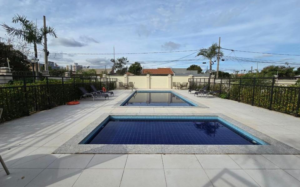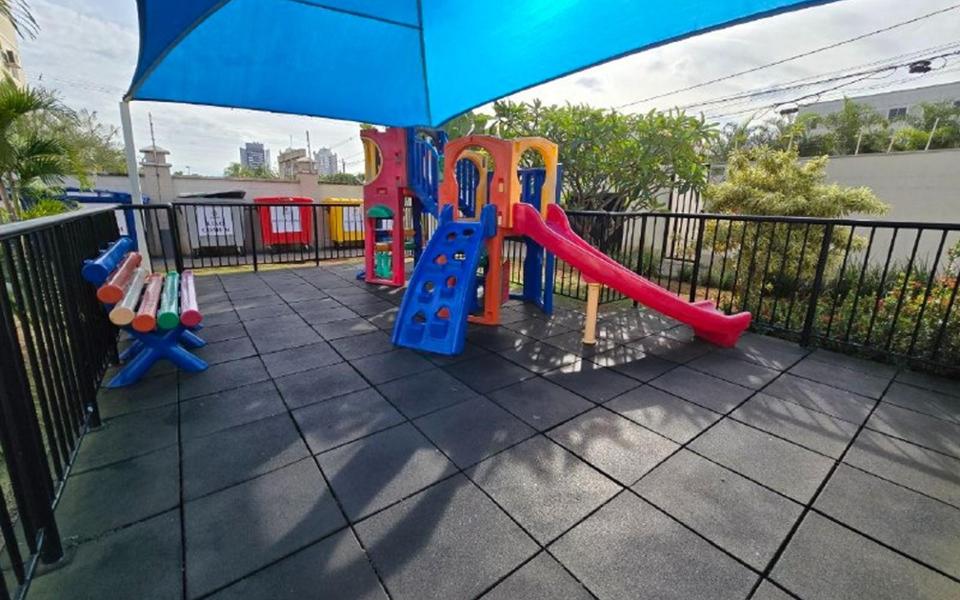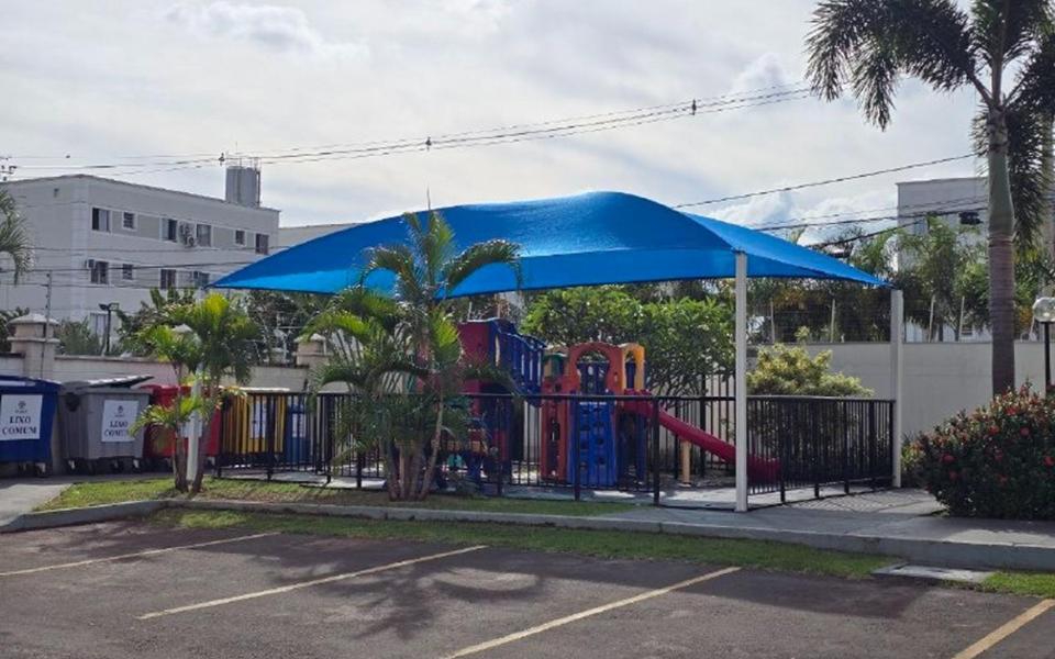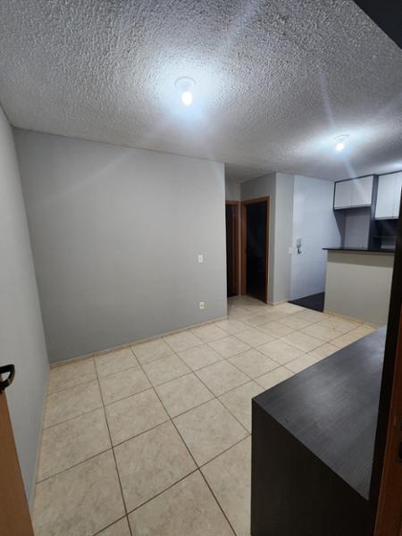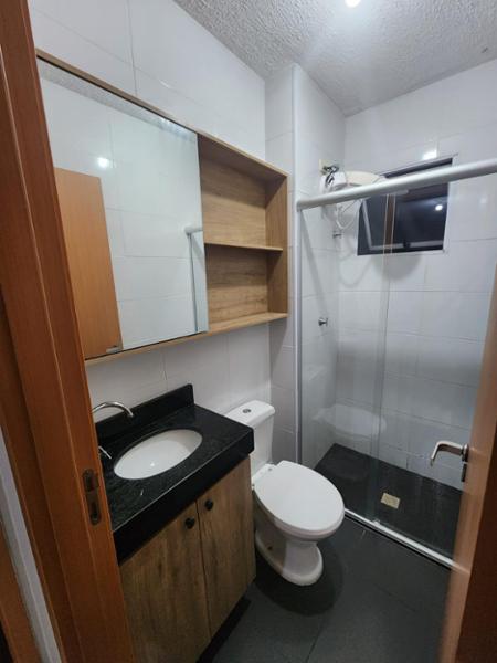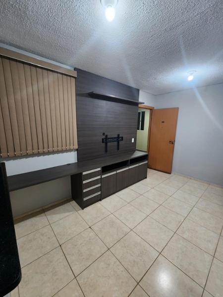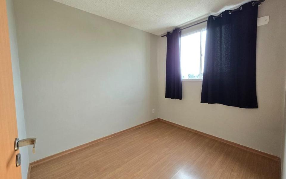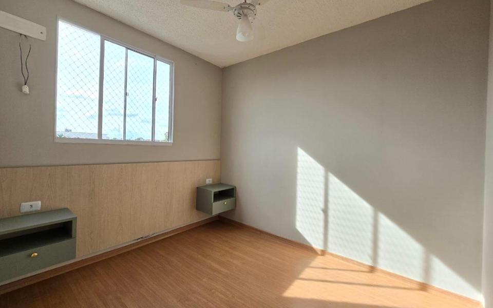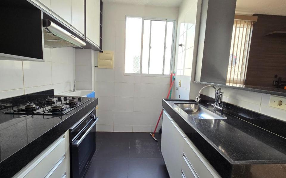 Apartamento de 42m² com sala contendo uma rack, cozinha planejada, 2 quartos, banheiro social planejado, e area de serviço. Condomínio com piscina, churrasqueira, minimercado 24h, e espaço infantil.