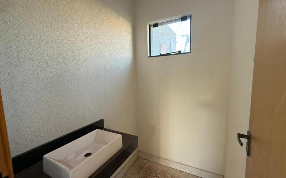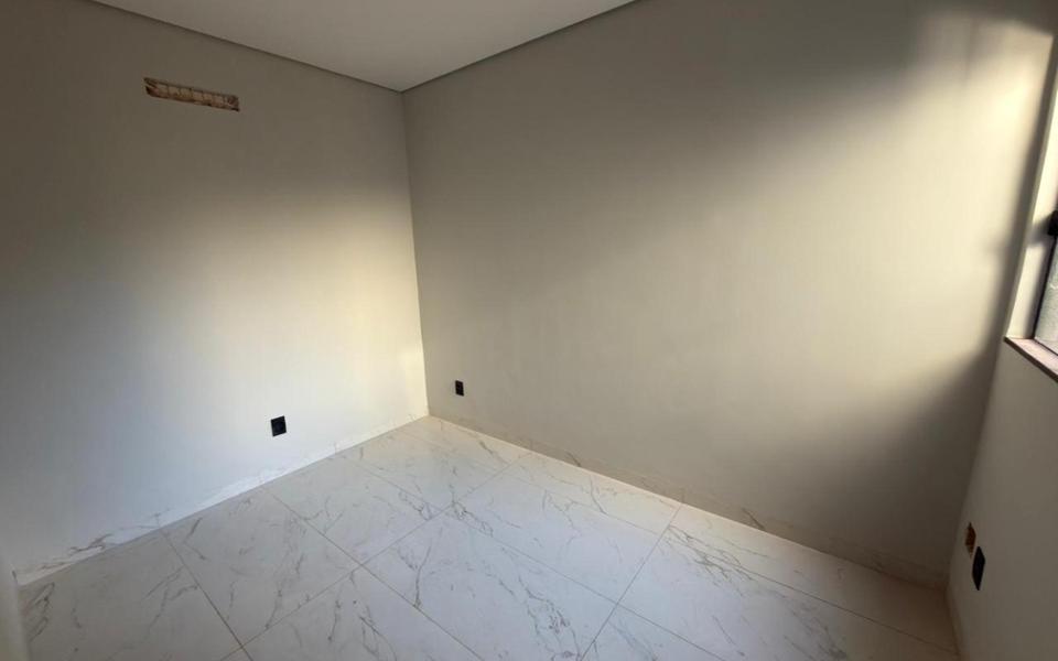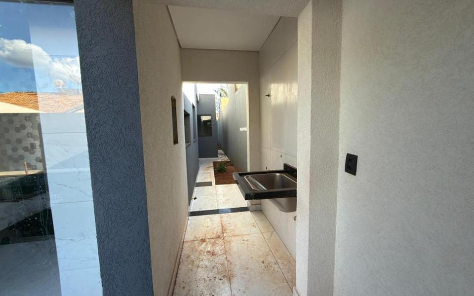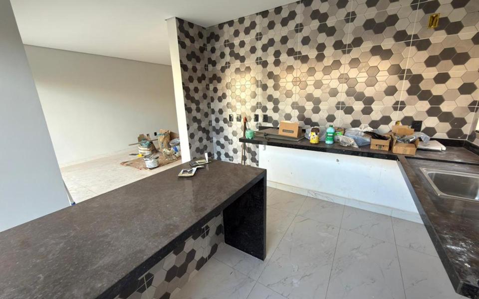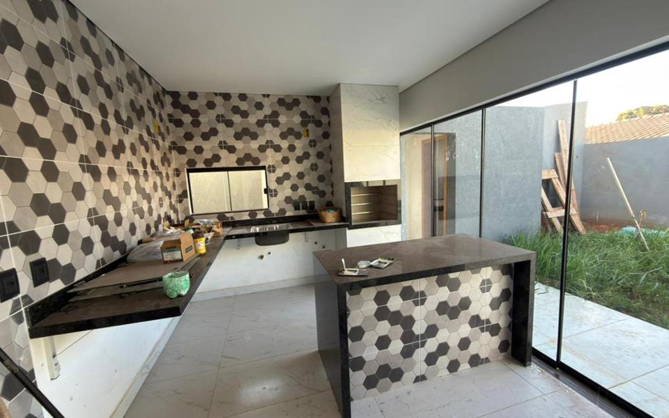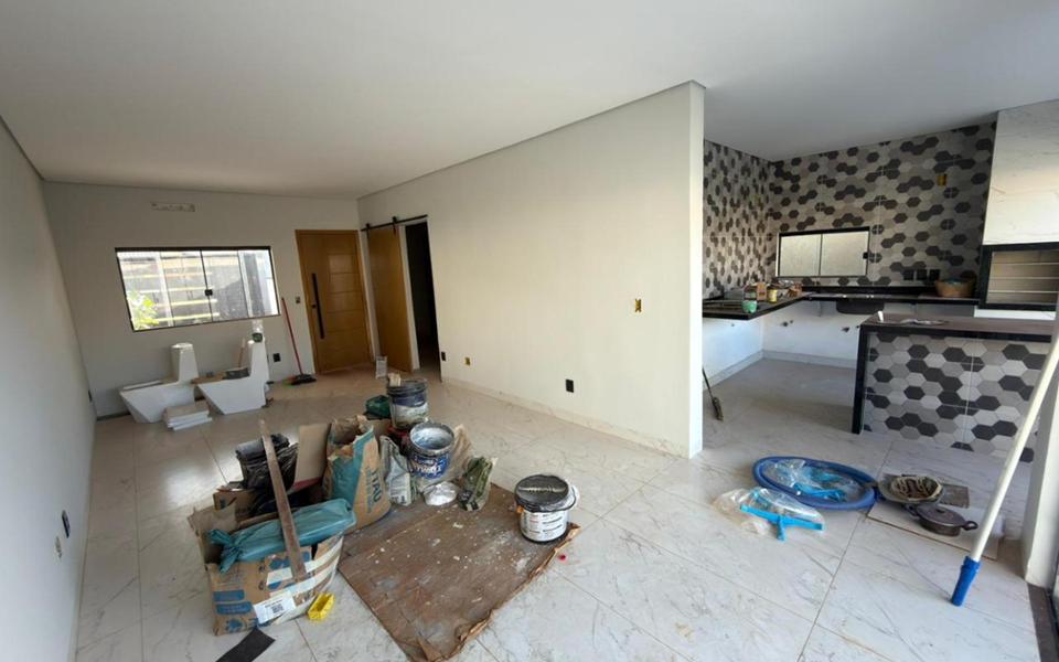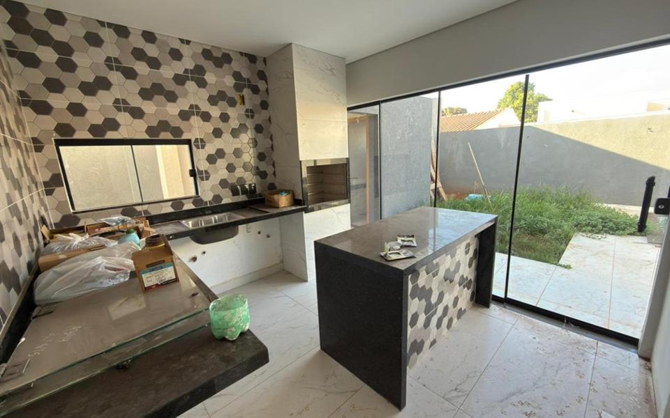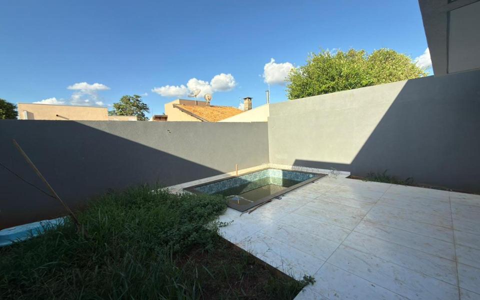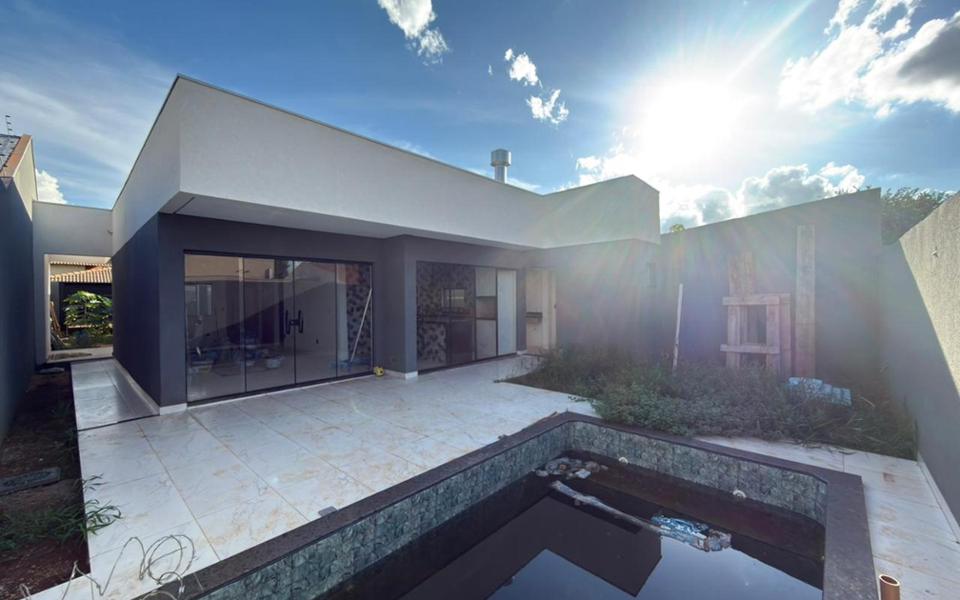 Casa nova com 3 quartos, sendo uma suíte com closet, sala de estar ampla, cozinha com bancada em "L" e ilha de granito, churrasqueira, piscina, área de serviço coberta e WC de serviço.